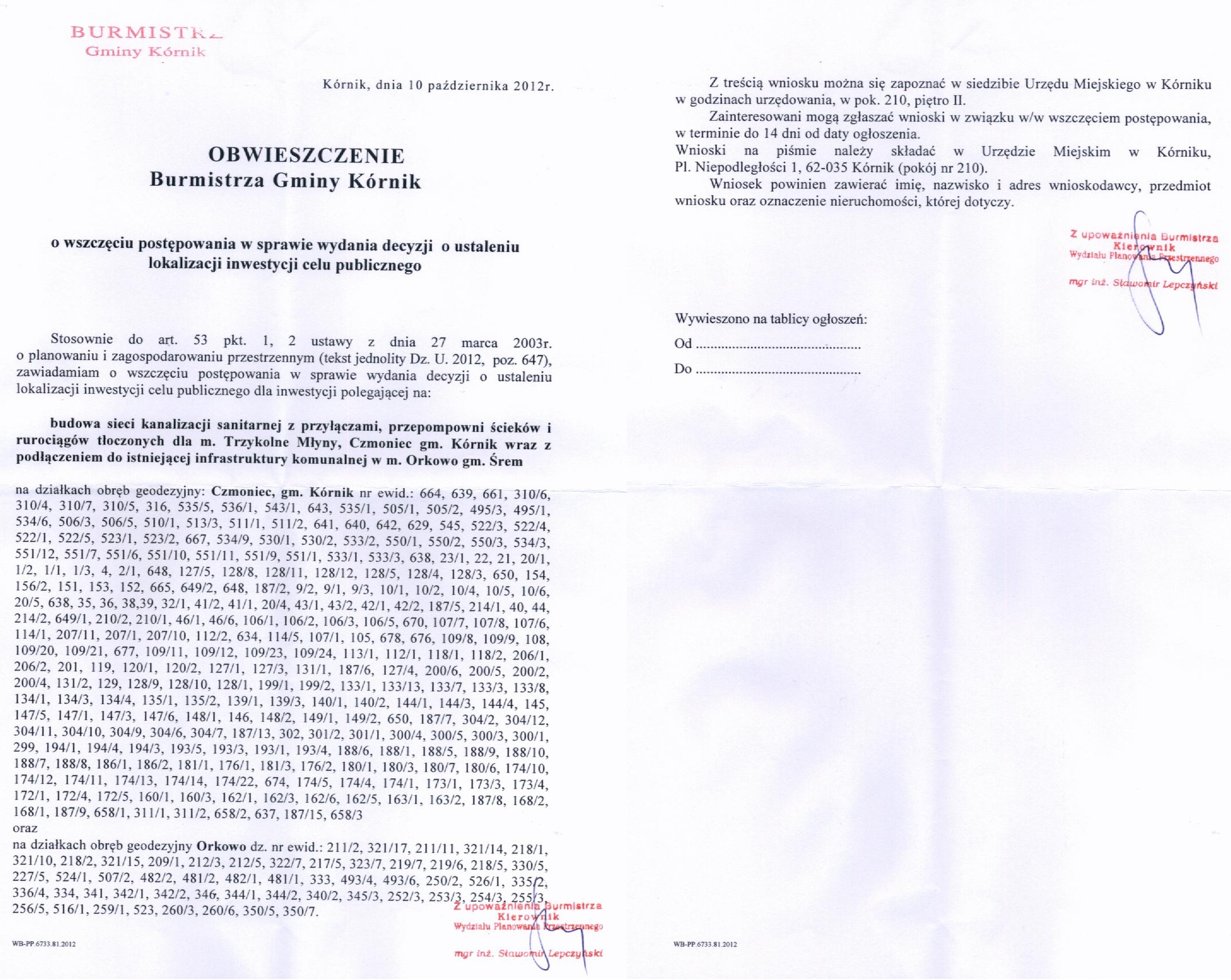 Obwieszczenie Burmistrza Kórnika - zawiadomienie o wszczęciu postępowania w sprawie ustalenie lokalizacji inwestycji celu publicznego dla przedsięwzięcia: budowa sieci kanalizacji sanitarnej z przyłączami, przepompowni ścieków i rurociągów tłocznych dla m. Trzykolne Młyny, Czmoniec gm. Kórnik wraz z podłączeniem do istniejącej infrastruktury komunalnej w m. Orkowo gm. Śrem, Orkowo dz. nr ewid.: 209/1, 211/2, 211/11, 212/3, 212/5, 217/5, 218/1, 218/2, 218/5, 219/6, 219/7, 227/5, 250/2, 252/3, 253