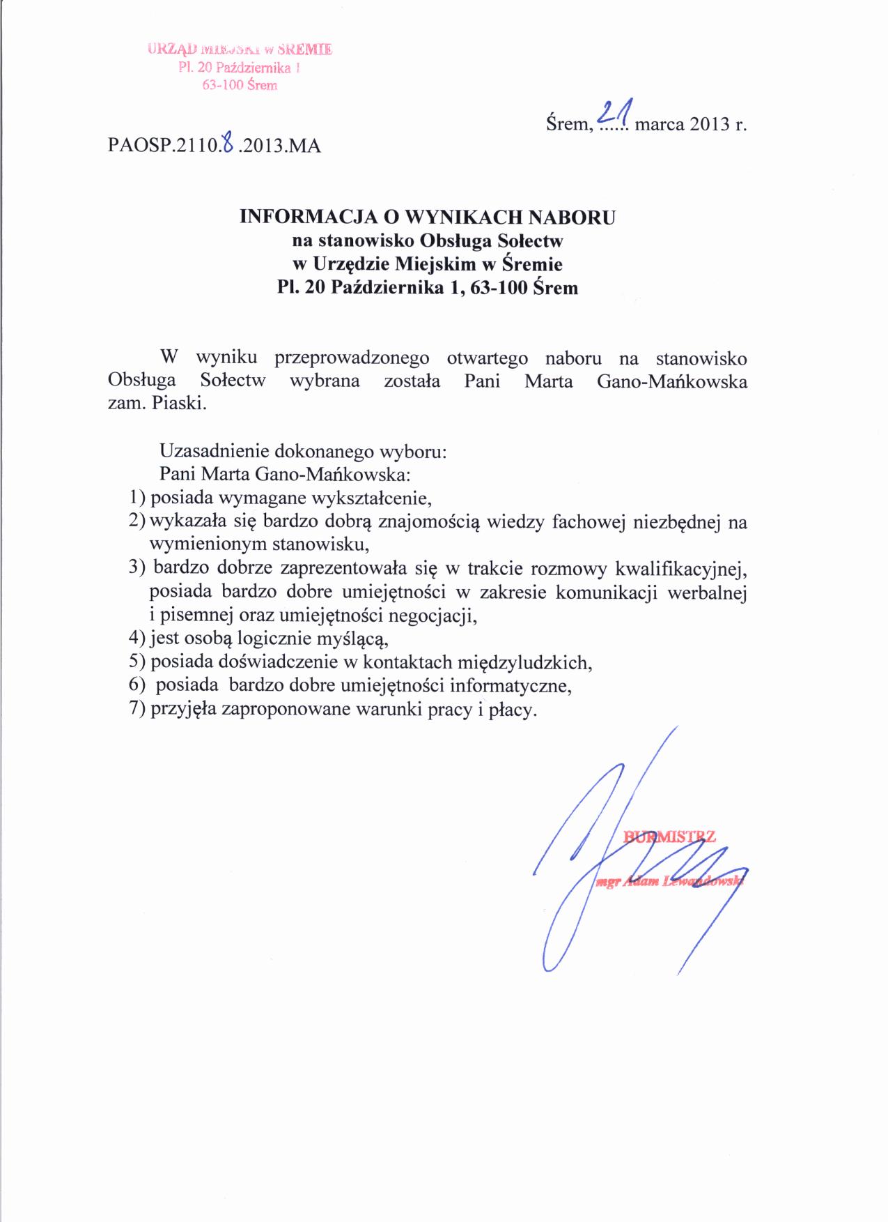 Informacja o wyborze na stanowisko obsługa sołectw