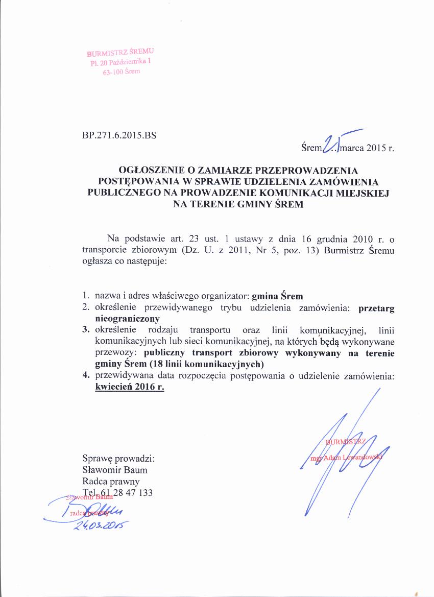 OGŁOSZENIE O ZAMIARZE PRZEPROWADZENIA POSTĘPOWANIA PRZETARGOWEGO NA PROWADZENIE KOMUNIKACJI MIEJSKIEJ 2015.jpeg