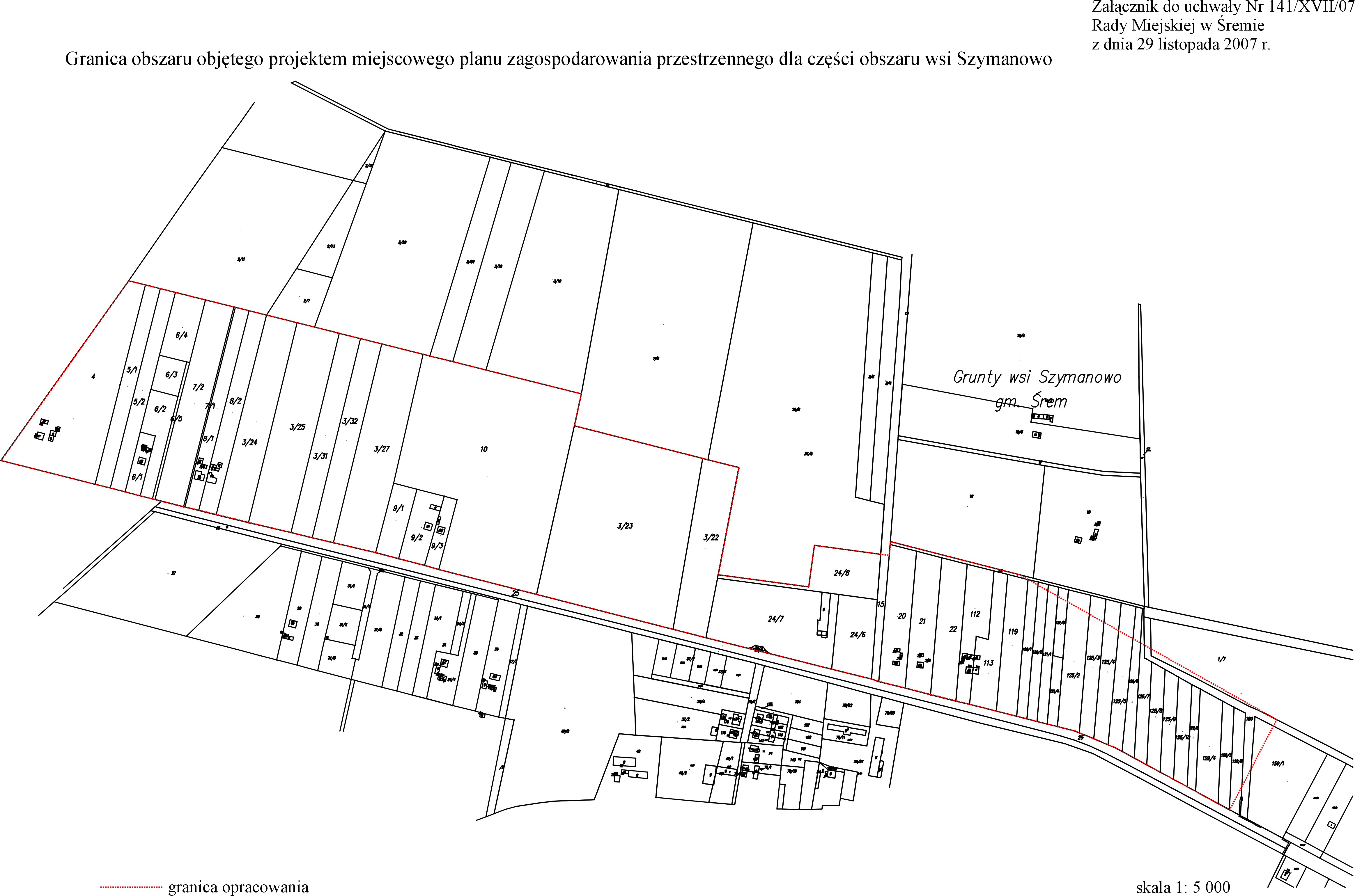 Załącznik - granica obszaru objętego projektem miejscowego planu zagospodarowania przestrzennego dla obszaru wsi Szymanowo Załącznik dokumentu Autor dokumentu: Zofia Kłak Udostępnił: