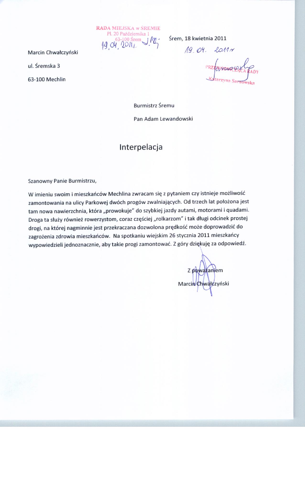 nazwa: treść pierwszej interpelacji radnego M.Chwałczyńskiego