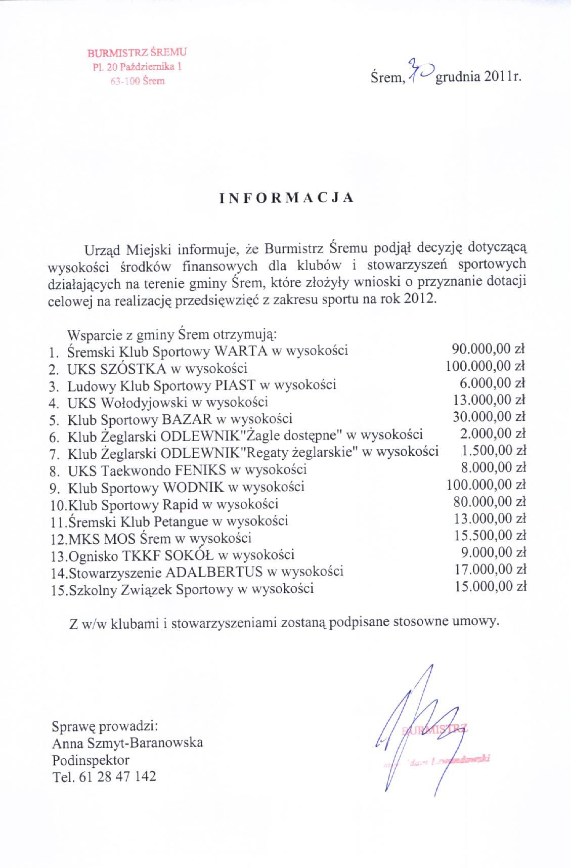 Informaccja- wysokość środków finansowych dla klubów i stowarzyszeń sportowych działających na terenie gminy Śrem, które złożyły wnioski o przyznanie dotacji celowej na realizację przedsięwzięć z zakresu sportu na 2012.jpg