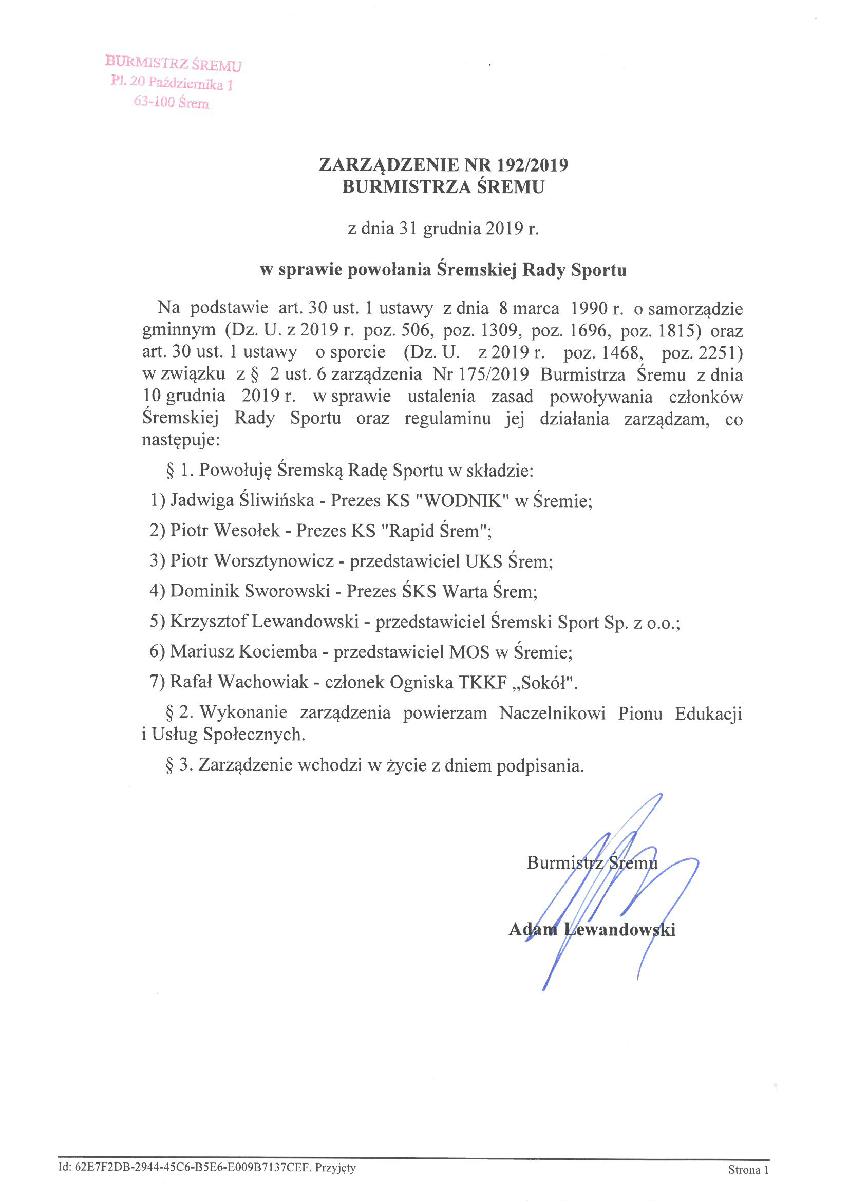 Zarządzenie Burmistrza Śremu w powołania Śremskiej Rady Sportu.jpg